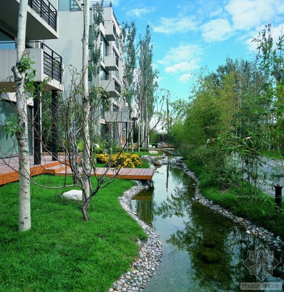 (4)小区内的河流开放空间廊道还应与小区外的开放空间系统组成完整的网络。线性公园绿地、林荫大道、步道及自行车道等皆可构成水滨通往居住区外的联系通道。